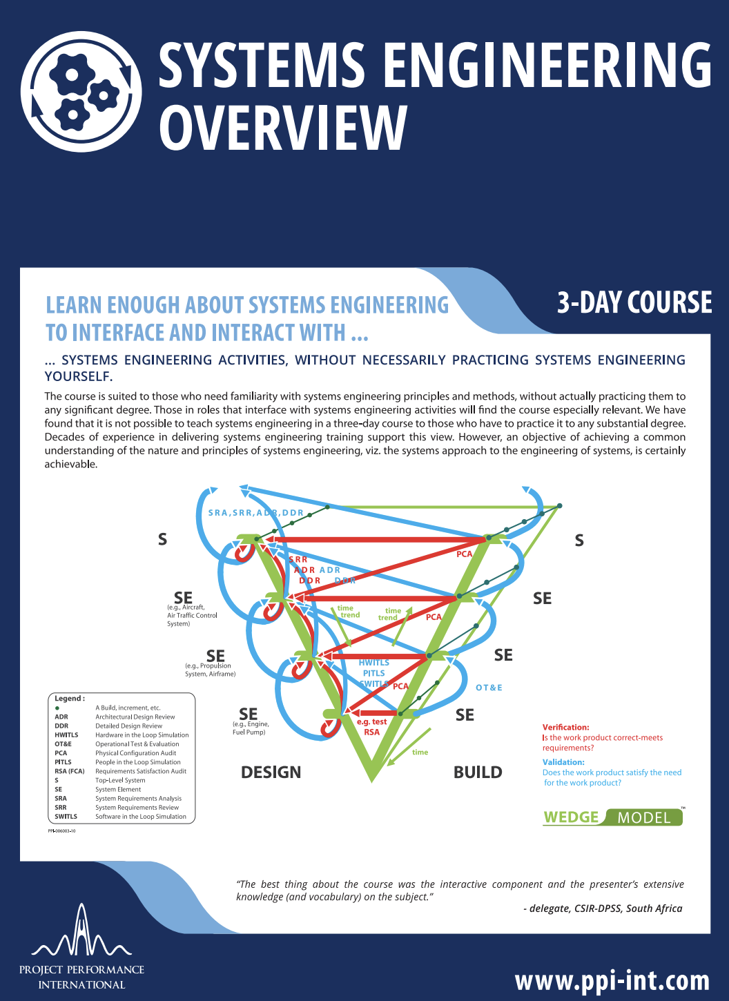 The course is suited to those who need familiarity with systems engineering principles and methods, without actually practicing them to any significant degree. Those in roles that interface with systems engineering activities will find the course especially relevant. We have found that it is not possible to teach systems engineering in a three-day course to those who have to practice it to any substantial degree. Decades of experience in delivering systems engineering in a three-day course to those who have to practice it to any substantial degree. Decades of experience in delivering systems engineering training to support this view. However, an objective of achieving a common understanding of the nature and principles of systems engineering, viz. the systems approach to the engineering of systems, is certainly achievable.