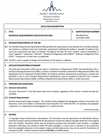 This Data Item Description (DID) may be cited in a Statement of Requirement (SOR), Task Specification (TS), a Contract Data Requirements List (CDRL), or within a standard invoked by a Statement of Requirement (SOR), Task Specification (TS) or Statement of Work (SOW). The external interface requirements pertaining to a system and specified in one or more Interface Requirements Specifications may be invoked by reference from a System Requirements Specification (SyRS), a Software Requirements Specification (SRS) or similar document.