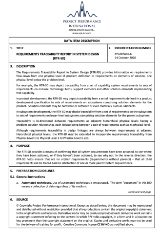 This DID provides requirements together with guidance for the content of a requirements database implementing requirements traceability in the system design and development application, including capability development. This DID also provides requirements and guidance for the content of a Requirements Traceability Report in System Design (RTR-SD). This DID contrasts with DID PPI-005695: “Requirements Traceability Report in Requirements Analysis (RTR-RA)”, which deals with the requirements analysis application of requirements traceability.