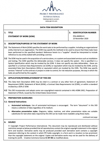System Specification which may be invoked by the SOW. It does not specify any data deliverables - these are specified in a Contract Data Requirements List (CDRL) or equivalent which may be invoked by the SOW, and by associated Data Item Descriptions (DIDs) or equivalent which are invoked by the CDRL.