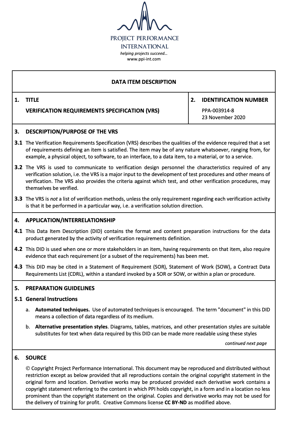 3.1 The Verification Requirements Specification (VRS) describes the qualities of the evidence required that a set of requirements defining an item is satisfied. The item may be of any nature whatsoever, ranging from, for example, a physical object, to software, to an interface, to a data item, to a material, or to a service.