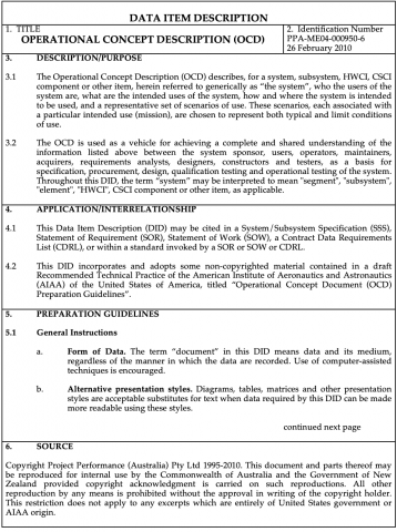The Operational Concept Description (OCD) describes, for a system, subsystem, HWCI, CSCI component or other item, herein referred to generically as “the system”, who the users of the system are, what are the intended uses of the system, how and where the system is intended to be used, and a representative set of scenarios of use.