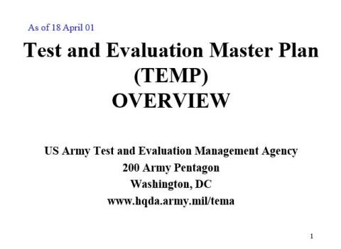 | Test and Evaluation Master Plan (TEMP) Overview.ppt | application/vnd.ms-powerpoint | 481.5 KB | English | DOWNLOAD! |