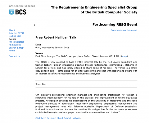"An executive professional engineer, manager and engineering practitioner, Mr Halligan is renowned internationally for his role in the practice and improvement of technology-based projects. Mr Halligan obtained his qualifications at the University of Melbourne and the Royal Melbourne Institute of Technology. After early engineering, engineering management and project management roles with Telecom Australia, Department of Defence (Australia), Rockwell International and Andrew Corporation, Mr Halligan has for the last twenty-two years contributed to major systems projects worldwide as a consultant and trainer."