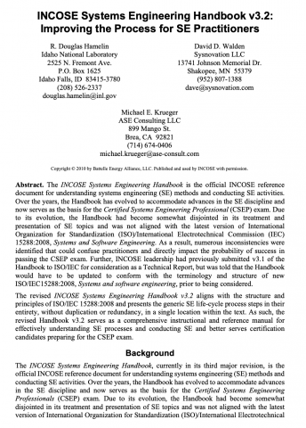 The 35-member Systems Engineering organization at the Idaho National Laboratory (INL) has over 750 years of collective experience providing systems-based products and services to a broad range of government and private industry customers. Nine of those systems engineers are CSEP certified, one recently received Expert Systems Engineering Professional (ESEP) recognition, and additional 15 are preparing to submit applications and take the CSEP exam. INL systems engineering identified numerous inconsistencies with the content and general structure of the Handbook v3.1 noting specifically that the organisation of the information required users to consult three or more separate locations within the text to fully understand a single process topic.