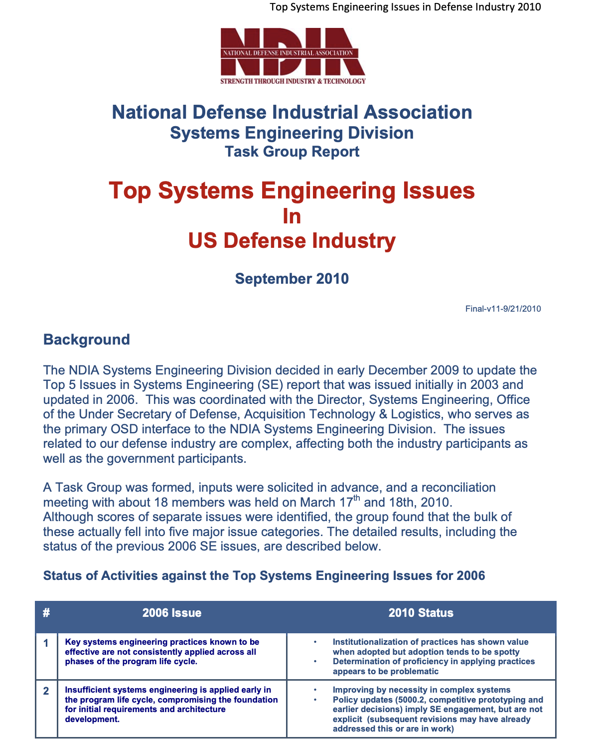 One other issue from 2006 related to engineering practices remains but has been made more specific, hopefully enabling more precise and focused action. Actions assigned to the NDIA are intended to be executed by the Systems Engineering Division. Where possible, the NDIA SED will solicit the collaboration of other industry groups (e.g., INCOSE, IEEE, AIA, and AIAA) to address the actions, in order to try to have a greater influence across the SE community.