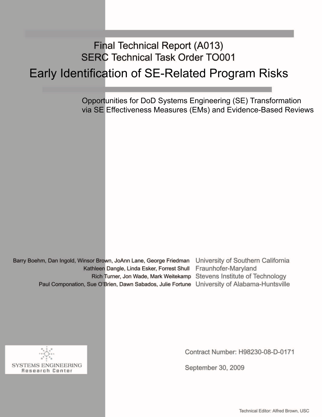 Section III summarizes the overall methods, assumptions, and procedures used in the EM task. Section IV begins with an analysis of the DoD needs, opportunities, and business case for the use of SE EM methods, process, and tools (MPTs). It finds that the business case is very strong for large MDAPs, and not very strong for ad-hoc, quick-response system development. It then elaborates the detail of the SE EM framework and tools, the concepts of operation for their use, their use on pilot projects, and their analysis in comparison with the Defense Acquisition Program Support (DAPS) Methodology and its Systemic Analysis Database (SADB) of DAPS assessment results. It concludes that the evidence of utility and business-case return on investment is sufficient to proceed toward enabling their broad DoD use, subject to performing further research on the factors necessary to ensure the EM MPTs’ scalability, extendability, and adaptability to change, and to performing the resulting improvements to the EM MPTs. It recommends a two-phase approach for achieving an initial operational capability and transitioning it to a sustaining organization. This would begin with research on approaches to the key issues, and continue with incremental elaboration, experimentation, and refinement of the preferred approaches.