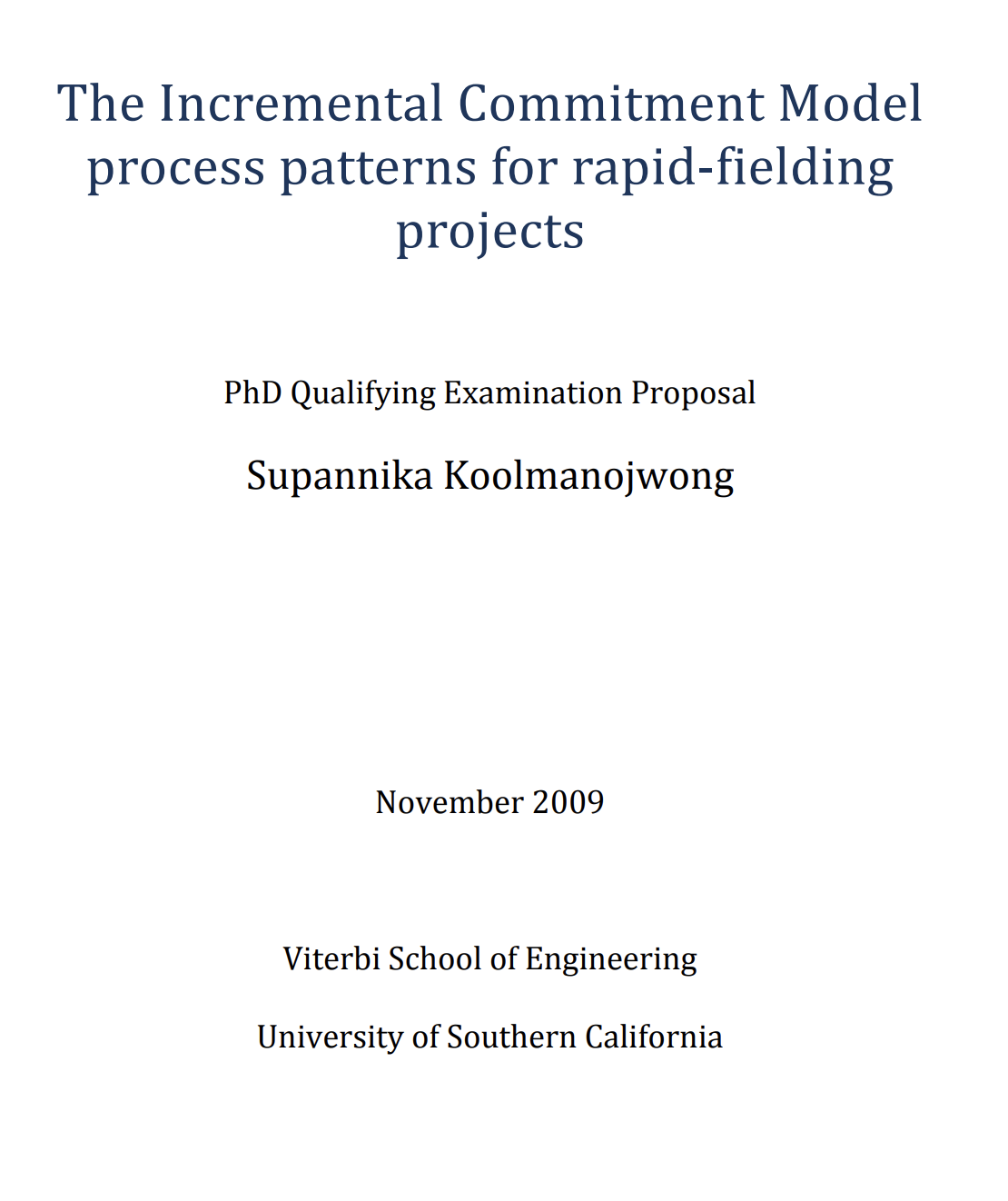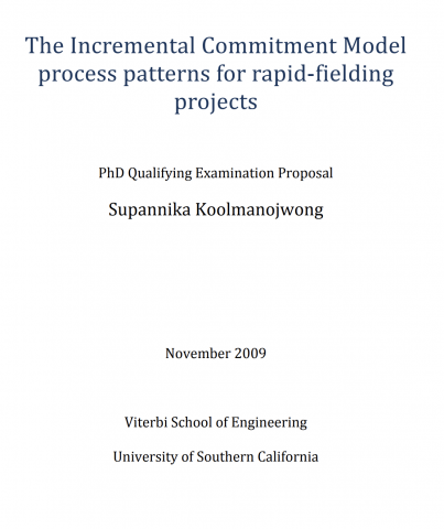 The USC real‐client MS‐level team projects provide a significant number of projects that are suitable to four of the ICM process patterns: Architected Agile, Use Single NDI, NDI‐intensive, and Services intensive. The research will test the hypothesis that the decision criteria are usable to determine a viable process during the first stage of the life cycle. Architected Agile exemplifies a scalable balance between plan‐driven and agile‐driven approaches [Boehm and Turner 2004]. NDI is an alternative for software developers to reduce development time and cost while increasing software quality and productivity via software reuse [Basili and Boehm 2001; Li et.al 2006]. Use single NDI provides an option