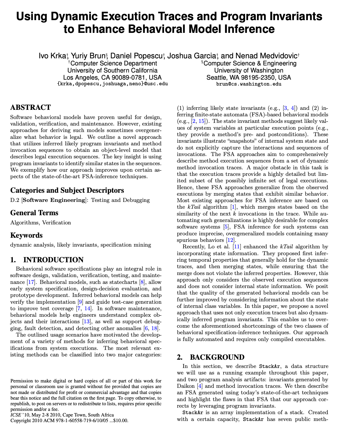 candidate for further testing and renement of the object specication. For example, the renement process identies that the looping transition labeled makeEmpty on state S02 is not traversed with the dynamic traces since it is a maybe transition. A detailed inspection of the implementation reveals this particular transition to be impossible and a result of overgeneralized program invariants.