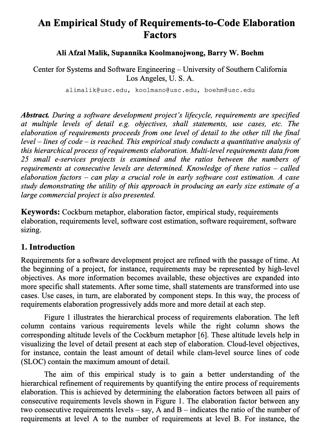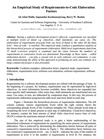 During a software development project’s life cycle, requirements are specified at multiple levels of detail e.g. objectives, shall statements, use cases, etc. The elaboration of requirements proceeds from one level of detail to the other till the final level – lines of code – is reached. This empirical study conducts a quantitative analysis of this hierarchical process of requirements elaboration. Multi-level requirements data from 25 small e-services projects is examined and the ratios between the numbers of requirements at consecutive levels are determined. Knowledge of these ratios – called elaboration factors – can play a crucial role in early software cost estimation. A case study demonstrating the utility of this approach in producing an early size estimate of a large commercial project is also presented.