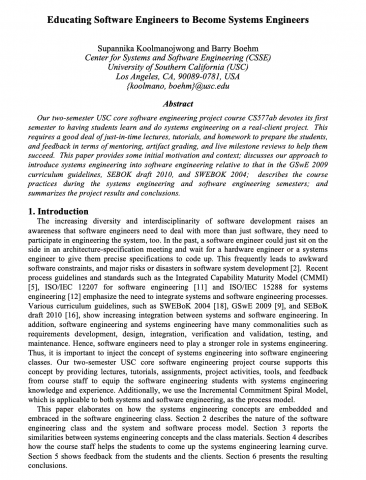Our two-semester USC core software engineering project course CS577ab devotes its first semester to having students learn and do systems engineering on a real-client project. This requires a good deal of just-in-time lectures, tutorials, and homework to prepare the students, and feedback in terms of mentoring, artifact grading, and live milestone reviews to help them succeed. This paper provides some initial motivation and context; discusses our approach to introduce systems engineering into software engineering relative to that in the GSwE 2009 curriculum guidelines, SEBOK draft 2010, and SWEBOK 2004; describes the course practices during the systems engineering and software engineering semesters; and summarizes the project results and conclusions.