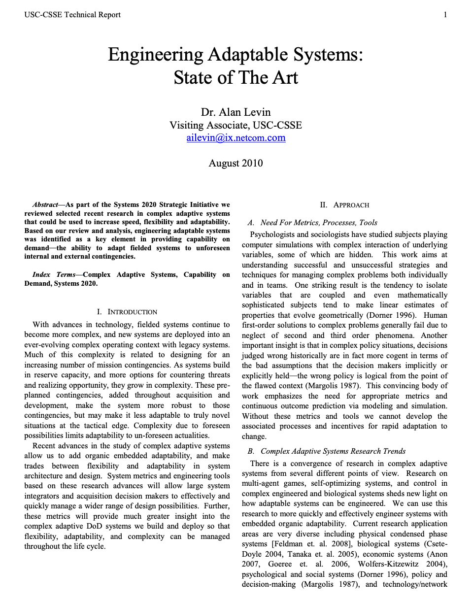 Self-optimization in complex adaptive systems is evolving in a similar way and moving from simple models with closed form solutions to consider extended approaches that are applied to problems formerly considered intractable. The approaches include multi-agent reinforcement learning with incremental feedback (Singh et. al. 2009), a variety of Monte Carlo methods (Wolpert 2006), evolutionary approaches that mimic biology (Wolpert-Macready 2005), and surprising self-modeling methods in robotics (Bongard et. al. 2006). Once again, the key to progress appears to be adding heuristics to analysis and combining empirical data from experiments or sensor measurements to assist in predicting system behavior. Just as in multi-agent games, there is the ability to self-optimize using empirical data rather than merely an empirical test after optimization. In fact, the line between multi-agent games and self-optimization is rather blurred though the techniques, and to some extent the preferred application areas, are still distinct. These self-optimization approaches give us insight into the definition and “measurement” of system level performance metrics as we explore the adaptability vs. flexibility trade space at a relatively high level of system abstraction.