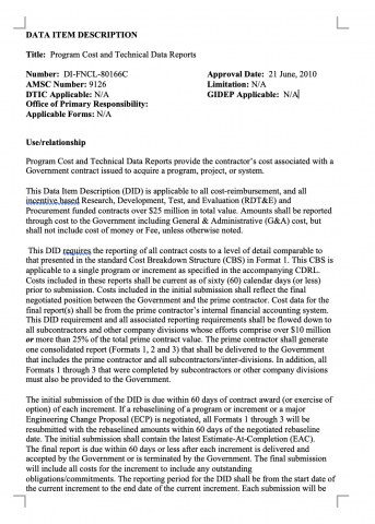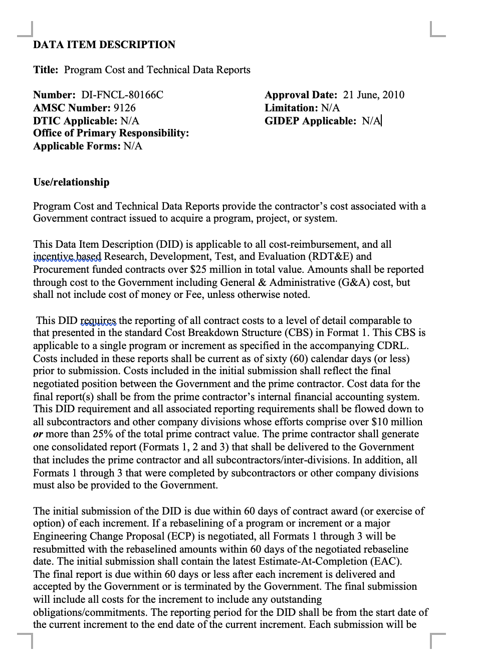 This DID requires the reporting of all contract costs to a level of detail comparable to that presented in the standard Cost Breakdown Structure (CBS) in Format 1. This CBS is applicable to a single program or increment as specified in the accompanying CDRL. Costs included in these reports shall be current as of sixty (60) calendar days (or less) prior to submission. Costs included in the initial submission shall reflect the final negotiated position between the Government and the prime contractor. Cost data for the final report(s) shall be from the prime contractor’s internal financial accounting system. This DID requirement and all associated reporting requirements shall be flowed down to all subcontractors and other company divisions whose efforts comprise over $10 million or more than 25% of the total prime contract value. The prime contractor shall generate one consolidated report (Formats 1, 2 and 3) that shall be delivered to the Government that includes the prime contractor and all subcontractors/inter-divisions. In addition, all