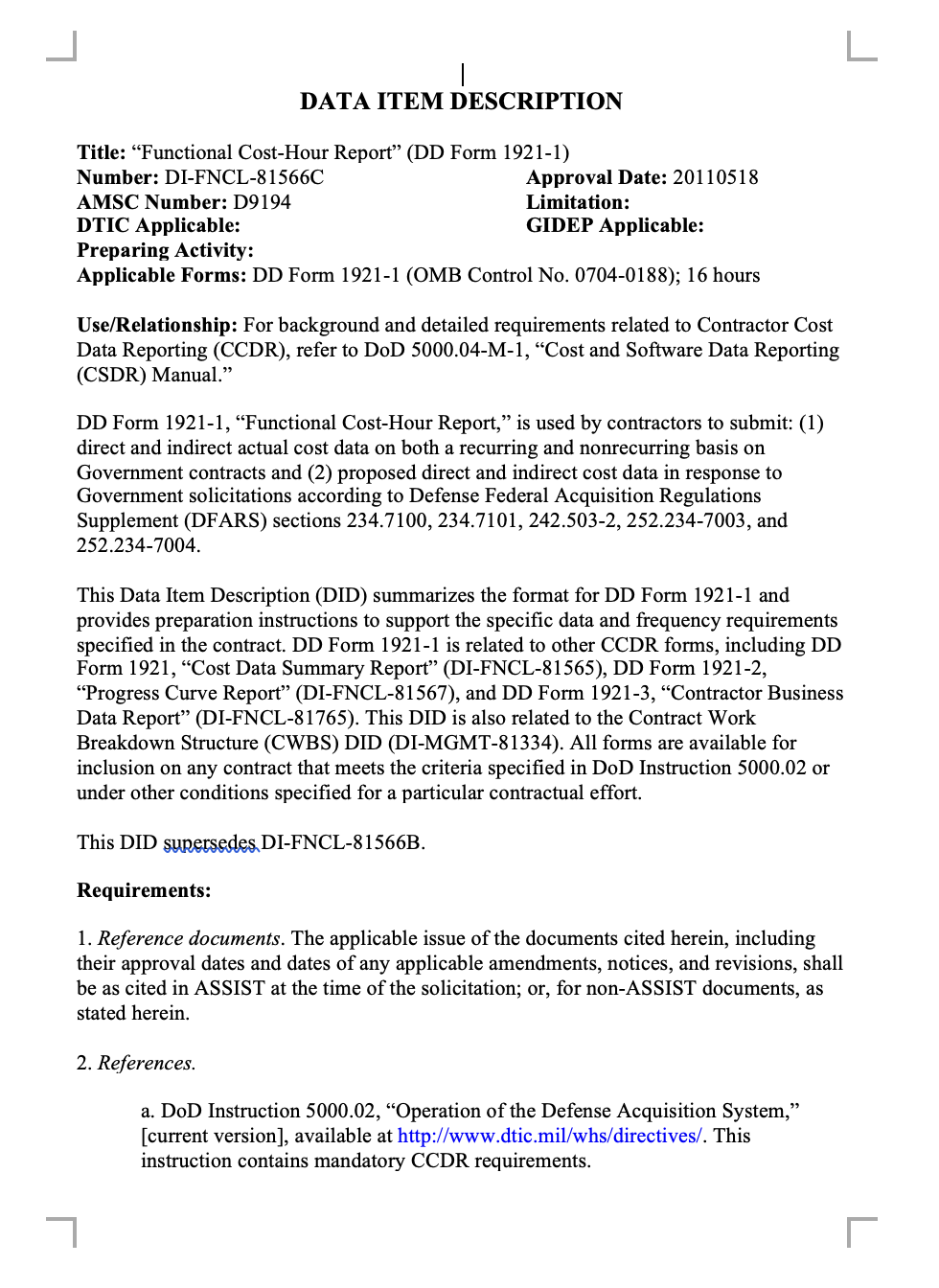 This Data Item Description (DID) summarizes the format for DD Form 1921-1 and provides preparation instructions to support the specific data and frequency requirements specified in the contract. DD Form 1921-1 is related to other CCDR forms, including DD Form 1921, “Cost Data Summary Report” (DI-FNCL-81565), DD Form 1921-2, “Progress Curve Report” (DI-FNCL-81567), and DD Form 1921-3, “Contractor Business Data Report” (DI-FNCL-81765). This DID is also related to the Contract Work Breakdown Structure (CWBS) DID (DI-MGMT-81334). All forms are available for inclusion on any contract that meets the criteria specified in DoD Instruction 5000.02 or under other conditions specified for a particular contractual effort.