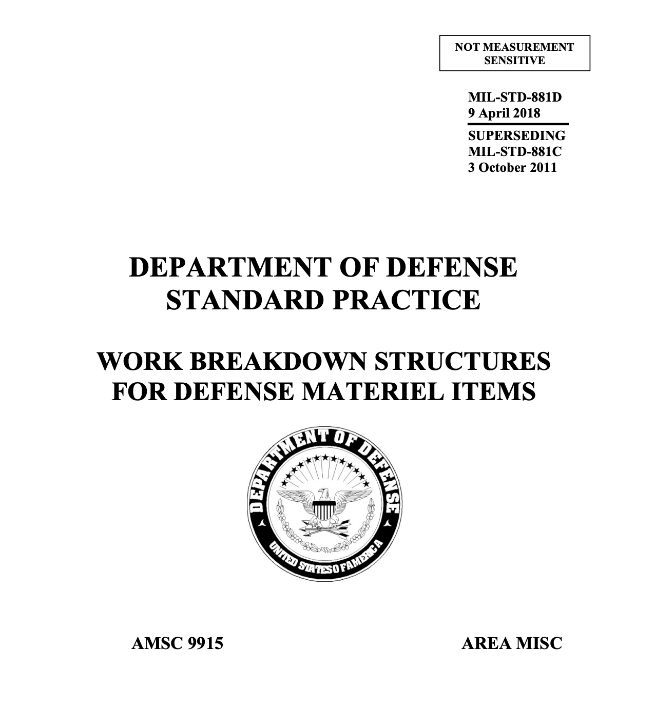 This Standard presents direction for effectively preparing, understanding, and presenting a Work Breakdown Structure (WBS). It provides the framework for Department of Defense (DoD) Program Managers to define their program’s WBS and to defense contractors in their application and extension of the contract’s WBS. Section 1 defines and describes the WBS. Section 2 provides instructions on how the WBS is applied as well as how to develop a Program WBS in the pre-award timeframe. Section 3 provides direction for developing and implementing a Contract WBS and Section 4 examines the role of the WBS in the post-award timeframe. This Standard also provides WBS definitions for specific defense materiel commodity systems in Appendices A through J. Appendix K addresses WBS elements that are common to all systems, as well as those which use unique elements (e.g., Space Systems, Information Systems/Defense Business Systems, Launch Systems, and Strategic Missile Systems). Appendix L presents for the DoD Sustainment Cost Reporting Structure (CRS) and its associated definitions for informational purposes. The purpose of providing sustainment information is to present an explanation of transitioning from reporting using a WBS to reporting sustainment costs using the CRS, regardless of acquisition phase or type of funds used.