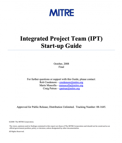 This Guide suggests how to set up, manage, and evaluate IPTs in government. It describes the most important decisions and key steps in IPT formation based on MITRE’s research into best practices in industry and government as well as organizational behavior research on work team performance.