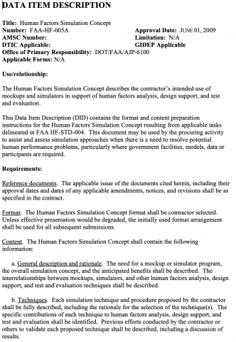 This Data Item Description (DID) contains the format and content preparation instructions for the Human Factors Simulation Concept resulting from applicable tasks delineated in FAA HF-STD-004. This document may be used by the procuring activity to assist and assess simulation approaches when there is a need to resolve potential human performance problems, particularly where government facilities, models, data or participants are required.