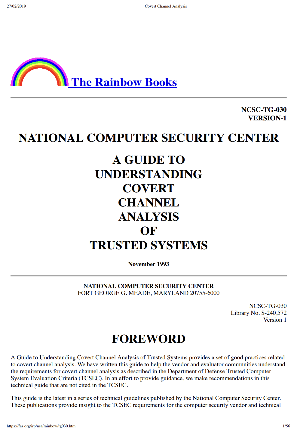 This guide is not a tutorial introduction to any topic of CCA. Instead, it is a summary of analysis issues that should be addressed by operating systems designers, evaluators, and accreditors to satisfy the requirements of the B2-A1 classes. Thus, we assume the reader is an operating system designer or evaluator already familiar with the notion of covert channels in operating systems. For this reader, the guide defines a set of baseline requirements and recommendations for the analysis and evaluation of covert channels. For the reader unfamiliar with CCA techniques used to date, the following areas of further documentation and study may be useful: