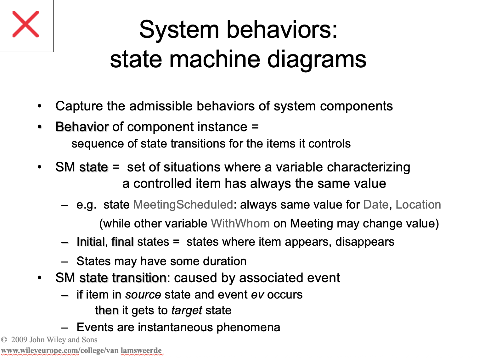 SM state = set of situations where a variable characterizing a controlled item has always the same value e.g. state MeetingScheduled: always same value for Date, Location (while other variable WithWhom on Meeting may change value)